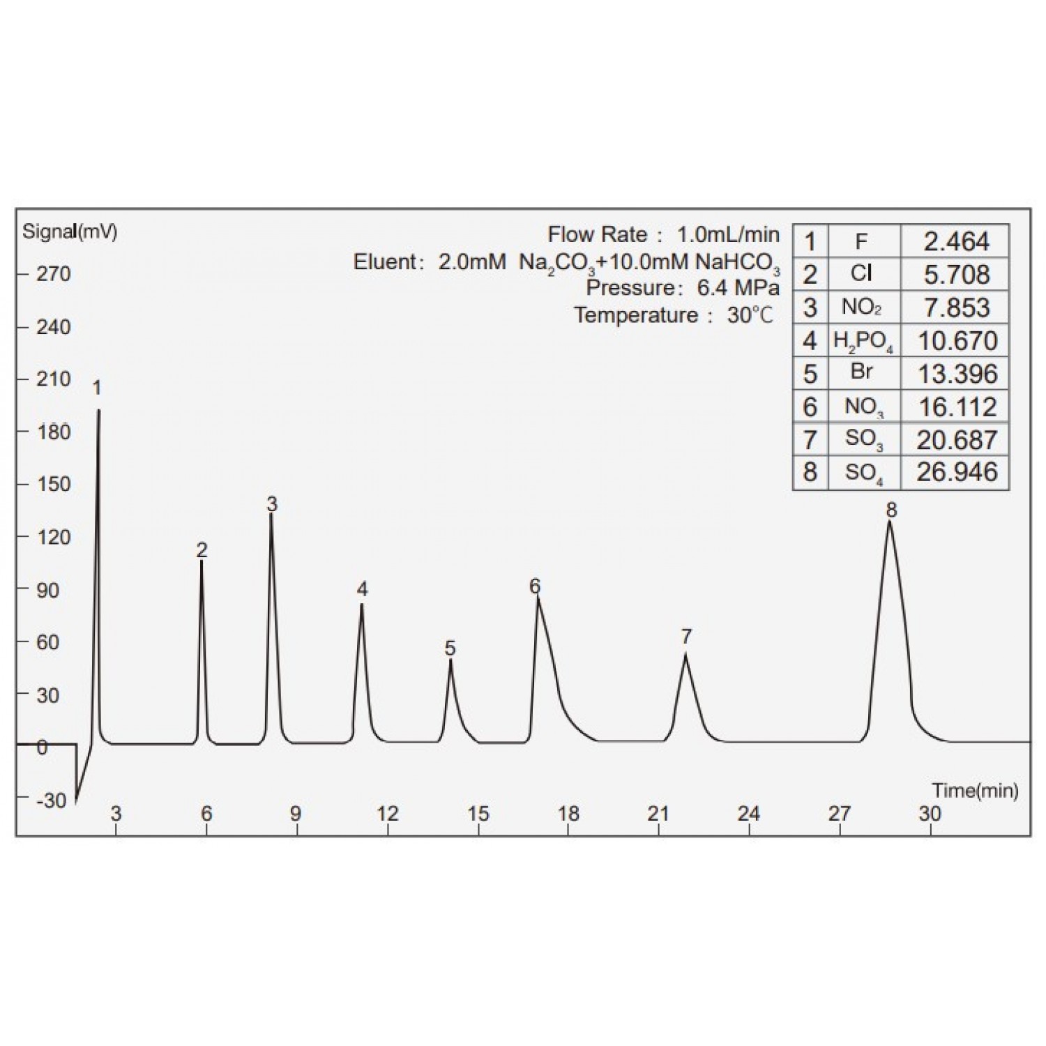 Пластикалық құбырлы анион бағанасы, гидроксил тірегін пайдаланады және бір уақытта жеті негізгі анионды талдай алады: фторид, бромат, хлорид, бромид, нитрит, нитрат, фосфат және сульфат (F, Cl, NO2, Br, NO3, H2PO4, SO4), және басқа да өнімдер. Дезинфекция.