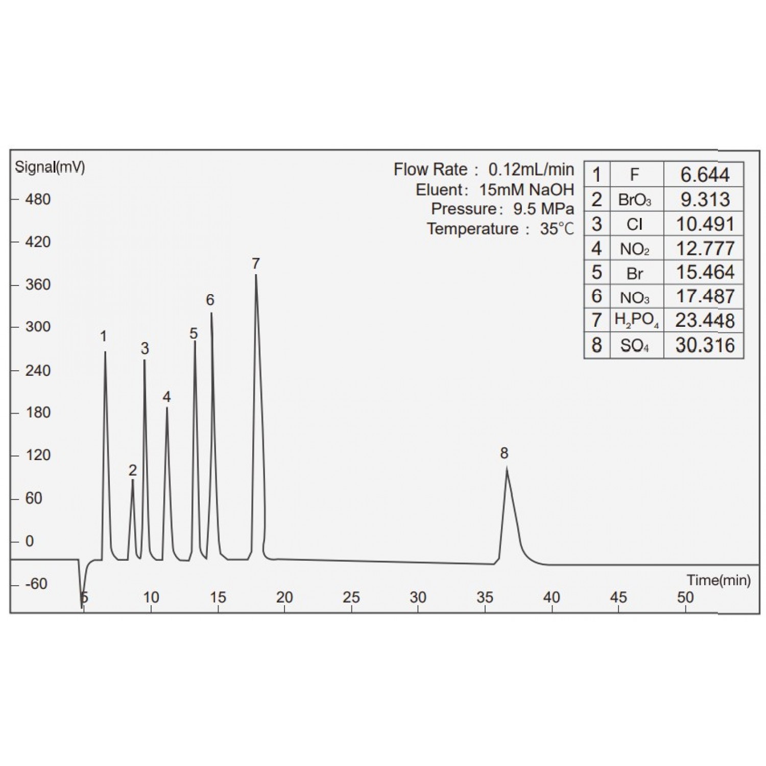 Пластикалық құбырлы анион бағанасы, гидроксил тірегін пайдаланады және бір уақытта жеті негізгі анионды талдай алады: фторид, бромат, хлорид, бромид, нитрит, нитрат, фосфат және сульфат (F, Cl, NO2, Br, NO3, H2PO4, SO4), және басқа да өнімдер. Дезинфекция.