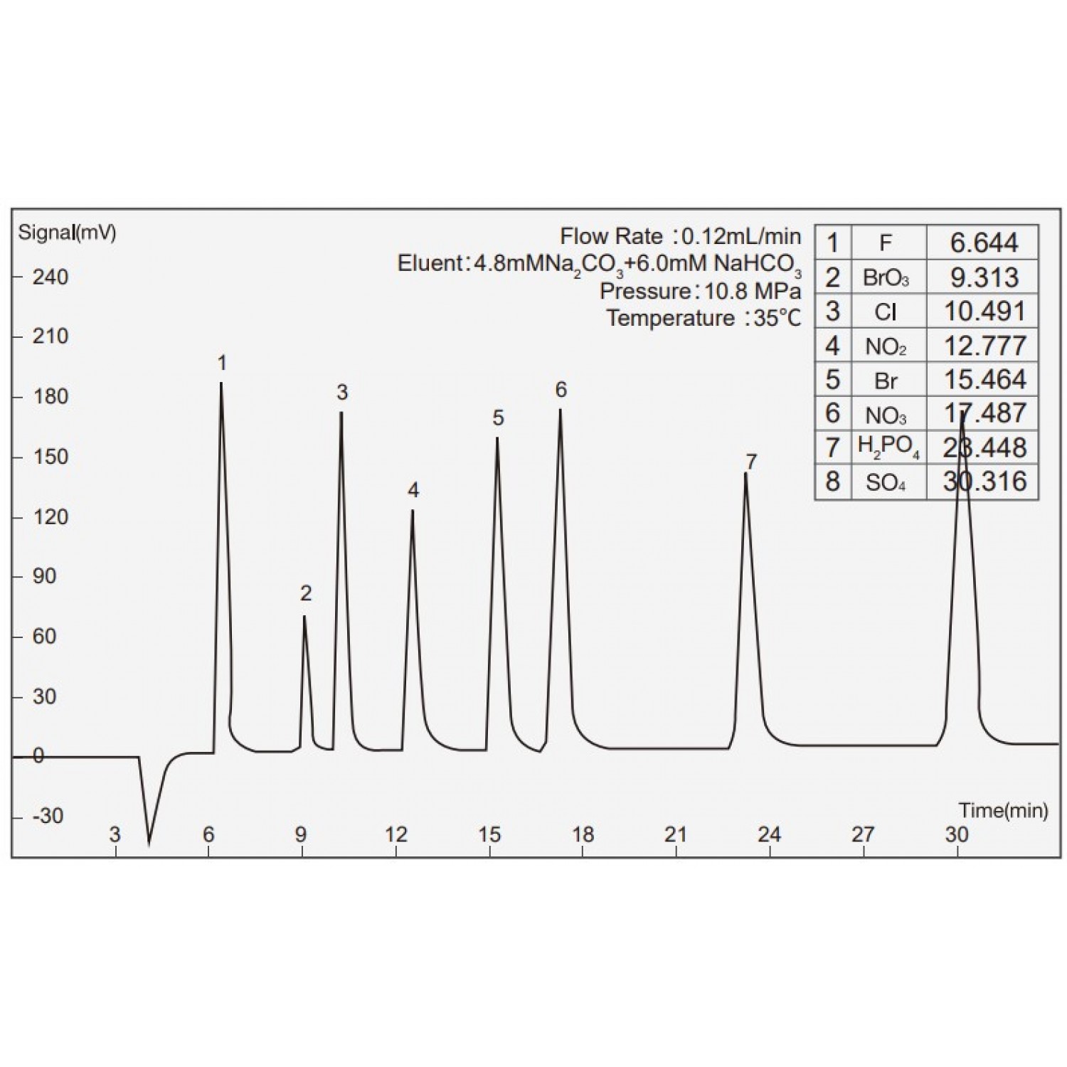 Пластикалық құбырлы анион бағанасы, карбонатты тасымалдаушыны пайдаланады, бір уақытта 7 негізгі анионды талдай алады: фторид, хлорид, бромид, нитрит, нитрат, фосфат және сульфат (F, Cl, NO2, Br, NO3, H2PO4, SO4 және басқа да өнімдер).