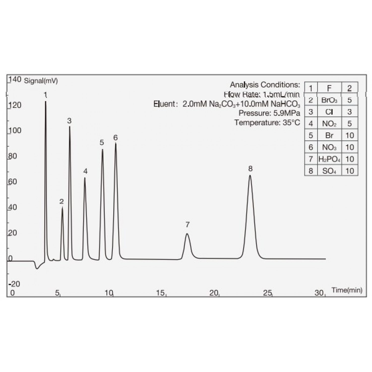 Пластикалық құбырлы анион бағанасы, гидроксил тірегін пайдаланады және бір уақытта жеті негізгі анионды талдай алады: фторид, бромат, хлорид, бромид, нитрит, нитрат, фосфат және сульфат (F, Cl, NO2, Br, NO3, H2PO4, SO4), және басқа да өнімдер. Дезинфекция.