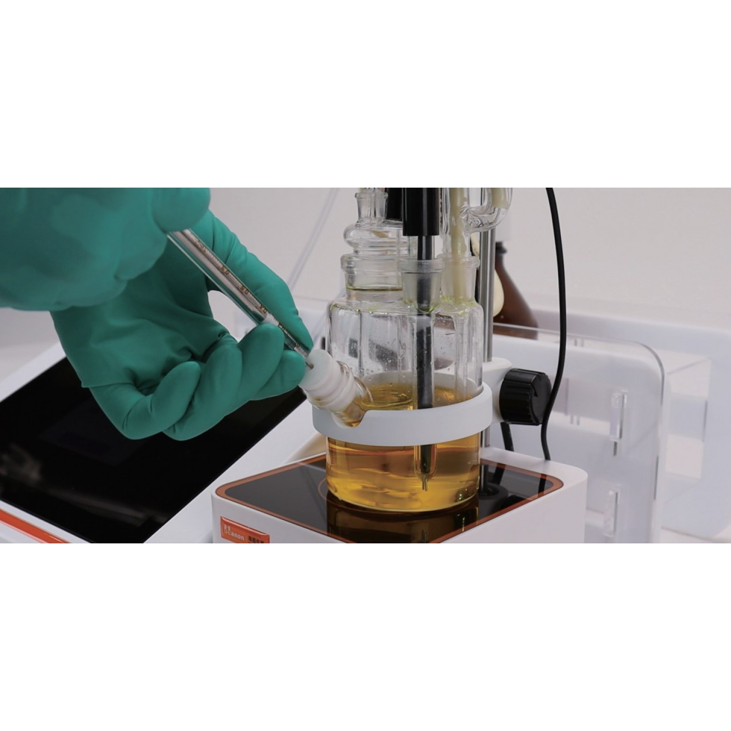 v Автоматты реагент ауыстыруды ауадан ылғалдың титрлеу стаканына түсуіне жол бермей, реакциялық шыныаяқты ашпай-ақ орындауға болады. Реагентті ауыстырғаннан кейін тепе-теңдік уақыты қысқарады, бұл оператордың улы реагенттің әсерін азайтады.