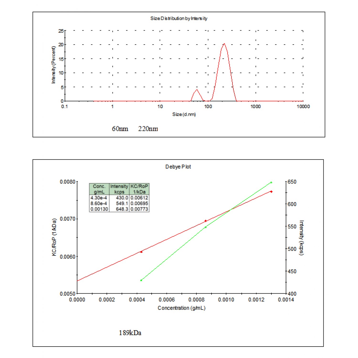 Молекулалық салмақты өлшеу диапазоны | <10,000 – 2 x 107 Иә, Debye диаграммасы бойынша есептелген (статикалық жарық шашырауы) |