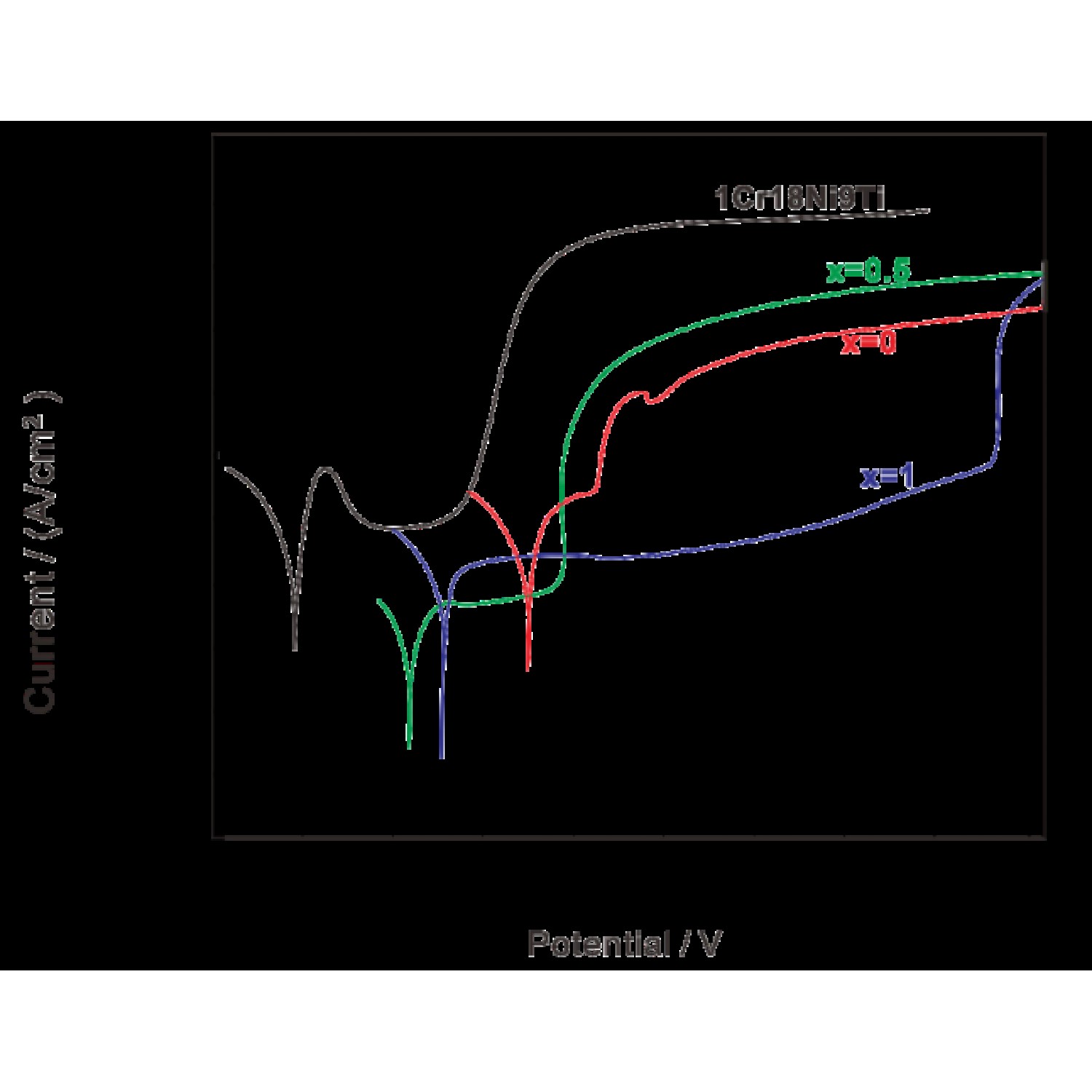 ерітіндісіндегі аморфты Ti негізіндегі қорытпа мен тот баспайтын болаттың поляризация қисығы