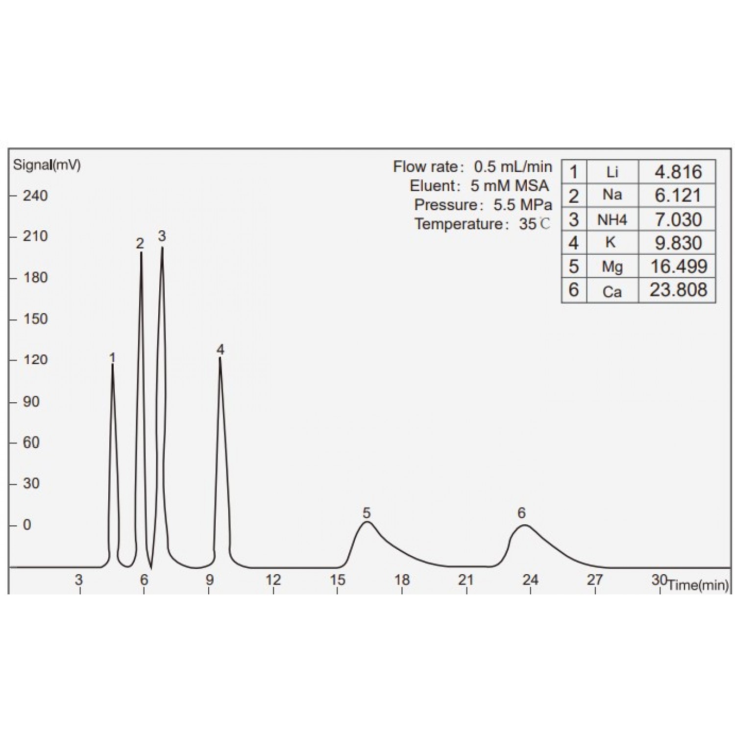 Әлсіз қышқыл катион бағанасы, метансульфон қышқылының тасымалдаушысын пайдаланады, бір уақытта 6 негізгі катионды талдай алады: литий, натрий, аммоний, калий, магний және төмен концентрацияларда кальций (Li, Na, NH4, K, Mg, Ca).