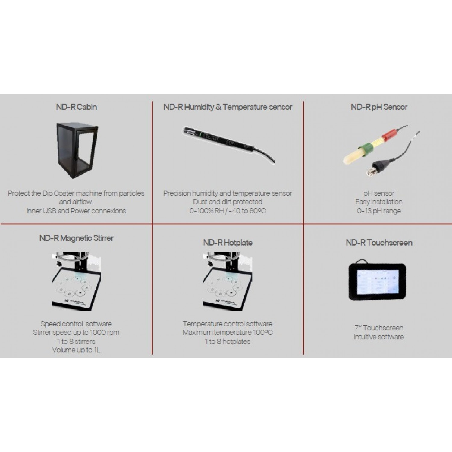 Nadetech ND-R Rotary Dip Coater - көп қабатты жұқа қабықшаларды батыру әдісін қолдану арқылы тұндыруға арналған толық автоматтандырылған жабдық. Оның дизайны және бағдарламаланатын бағдарламалық құралы жоғары дәлдікпен және қайталану мүмкіндігімен әрбір тұндыру параметрін басқаруға және автоматтандыруға мүмкіндік береді. ND-R Dip Coater золь-гель, қабат-қабат құрастыру және басқа батыру технологиялары арқылы көп қабатты нанометрлік жабындарды өндіру үшін қолданылады.