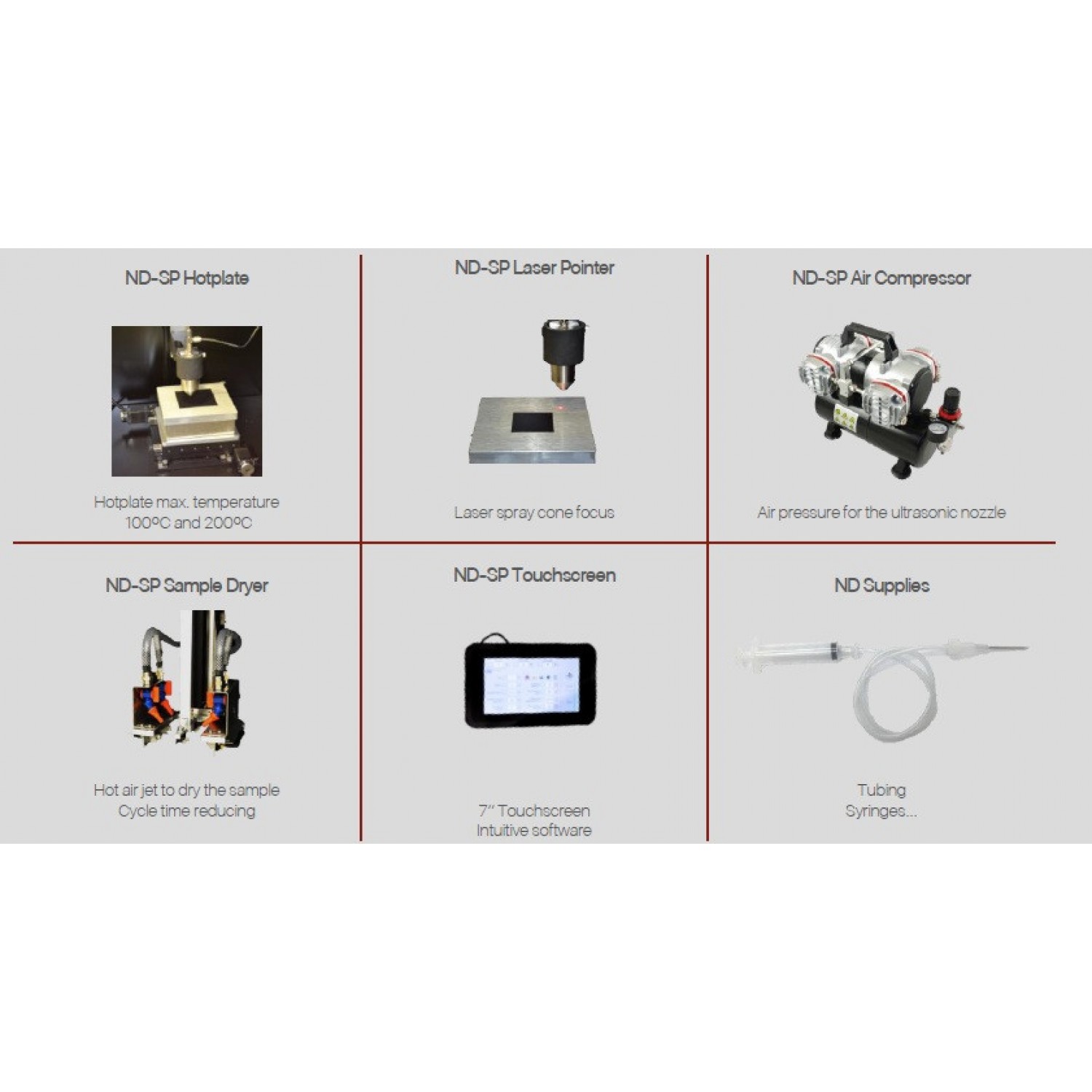 Nadetech ND-SP ультрадыбыстық бүріккіш қаптама өте кішкентай тамшыларды қажет ететін бүріккіш жабын қолданбаларына арналған. Ультрадыбыстық бүріккіш саптаманың арқасында жүйе орташа диаметрі 15 микрометр болатын тамшыларды және тамшылардың мөлшерінің біркелкі таралуын шығарады. Бұл әдіс қажет жабын материалының мөлшерін 80% дейін азайтады. Электроника, денсаулық сақтау, энергетика, жетілдірілген материалдар және басқа смарт жабындардағы арнайы қолданба қажеттіліктерін қанағаттандыру үшін бірнеше конфигурацияларды бағдарламалауға болады. ND-SP ультрадыбыстық шашыратқышты тік немесе көлденең күйде конфигурациялауға болады.