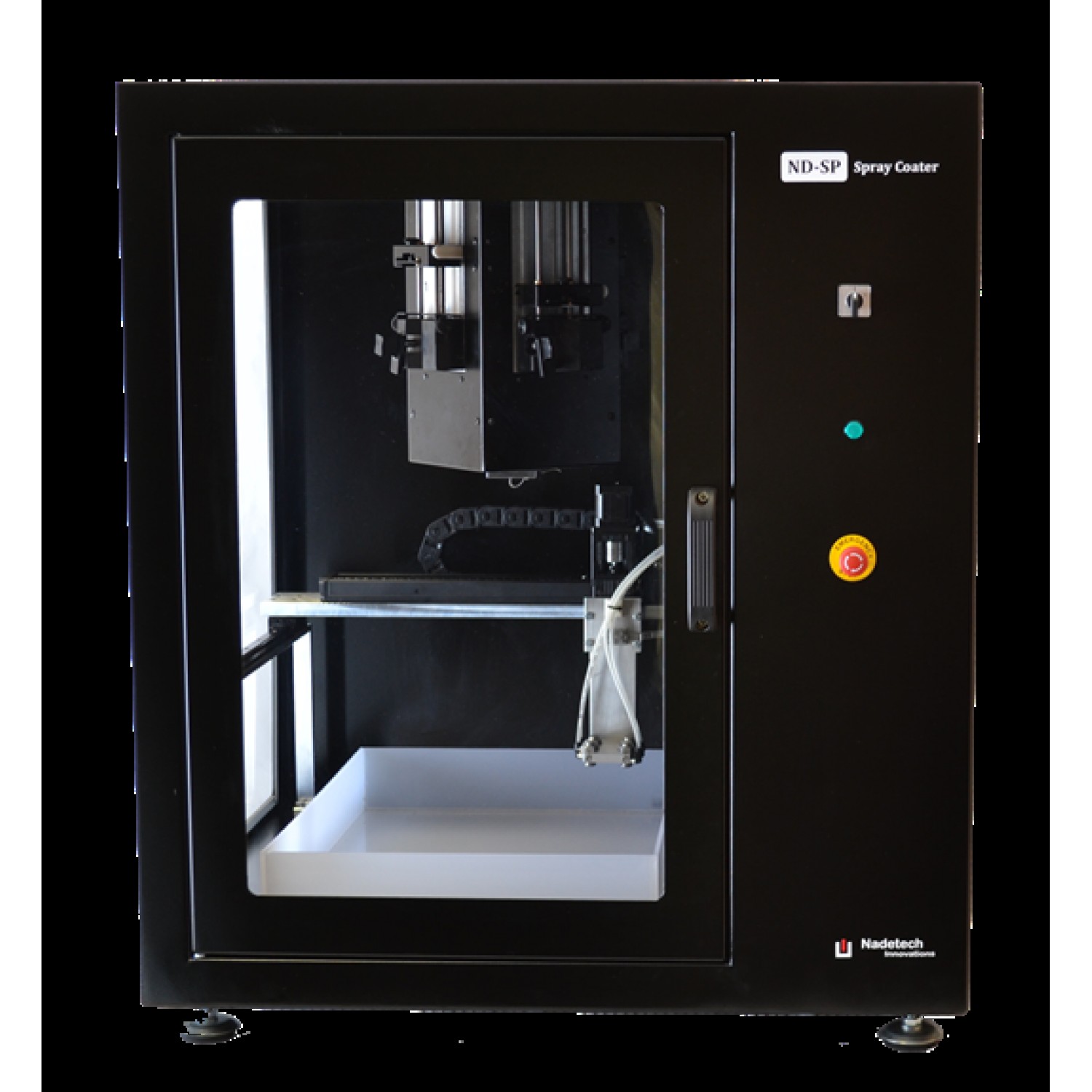 Nadetech ND-SP - біркелкі және кішкентай тамшылардың өлшемдерін қажет ететін жұқа қабықшаларға арналған толық автоматтандырылған бүріккіш жабын жүйесі. Оның дизайны және бағдарламаланатын бағдарламалық құралы жоғары дәлдікпен және қайталану мүмкіндігімен әрбір тұндыру параметрін басқаруға және автоматтандыруға мүмкіндік береді. ND-SP Precision Spray жүйесі бір немесе бірнеше қабаттары бар біркелкі жабындарды өндіру үшін қолданылады.