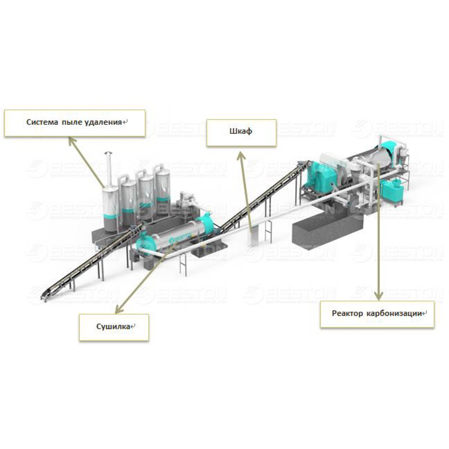 Тауық көңін көміртекке дейін үздіксіз өңдеу, бір жүкке 3 тонна/сағ.