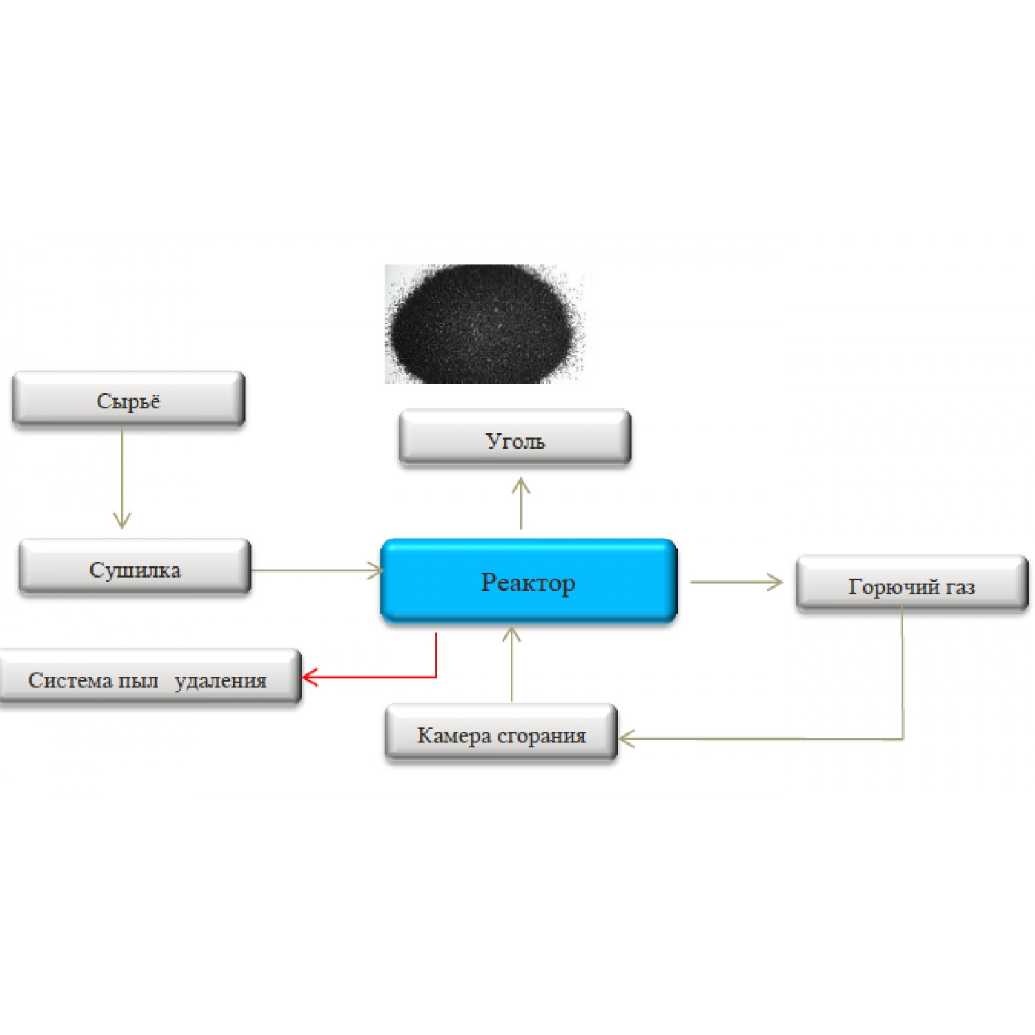 Жабдық лигнинге, целлюлозаға және гемицеллюлозаға бай сабан, үгінділер, күріш қабығы, кокос қабығы, пальма қабығы, ағаш қабығы, бөренелер, бөренелер, пальма жібектері және т.б. сияқты қалдықтарды өңдеуге арналған. Пиролиз кезінде шикізаттың құрамындағы көміртегі мен сутегі элементтері бір мезгілде көмір түзетін сутегі, метан, этан, көміртек оксиді және т.б. сияқты жоғары калориялы аралас жанғыш газдарға айналады. Реакция механизмі: шикізатты оттегісіз күйде жабық ыдыста бақыланатын қалпына келтіру реакциясы. Реакция процесі келесідей: